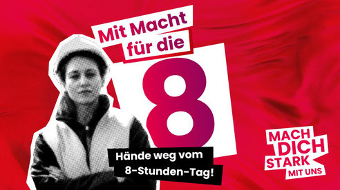 Mit seiner aktuellen bundesweiten Kampagne "Mit Macht für die 8“ wirbt der DGB für die hohe Bedeutung des 8-Stunden-Tages bzw. des derzeitigen Arbeitszeitgesetzes für den Schutz der Beschäftigten, besonders in solchen Branchen, wo keine Tarifverträge gelten.