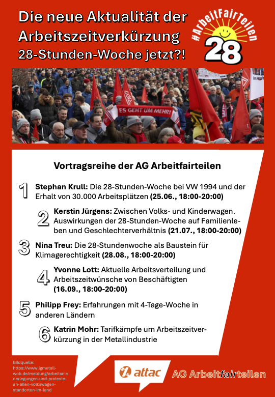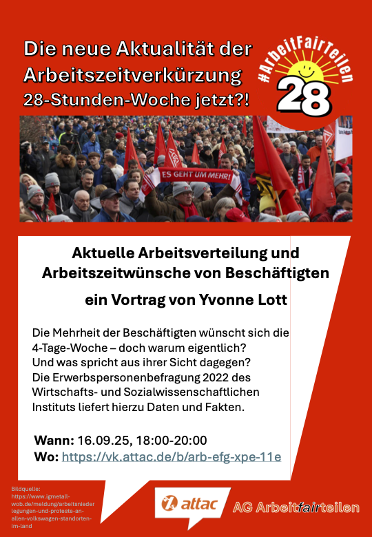 Wir benötigen heute für die Herstellung notwendiger Güter nur noch etwa die Hälfte der Zeit wie im Jahr 1960, als noch 48 Stunden gearbeitet wurde; insofern könnte die Arbeitszeit sogar in Richtung 20-Stunden Woche tendieren. Arbeitszeitverkürzung bietet nicht nur Lösungen für eine Vielzahl von Herausforderungen, darunter Fachkräftemangel, die Vereinbarkeit von Beruf und Privatleben sowie die dringend benötigte Klimawende, ohne die Sorge vor dem Verlust von Arbeitsplätzen, sondern auch neue Perspektiven. Ziel von Arbeitszeitverkürzung (AVZ) ist, Arbeit, Zeit und Einkommen umzuverteilen und damit ein gutes Leben für alle zu ermöglichen. Sie ist ein zentraler Baustein eines sozial-ökologischen Umbaus und einer geschlechtergerechten Umverteilung.