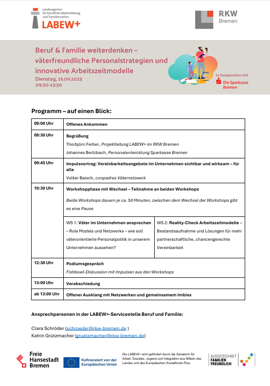 In vier digitalen Qualifizierungsmodulen zu den Themen Arbeitszeit, Gesundheit & Stress, Pflege von Angehörigen und Weiterbildungen werden verschiedene Aspekte der Vereinbarkeit aus wissenschaftlicher und betrieblich- praktischer Perspektive beleuchtet. Anmelden könnt ihr euch hier.